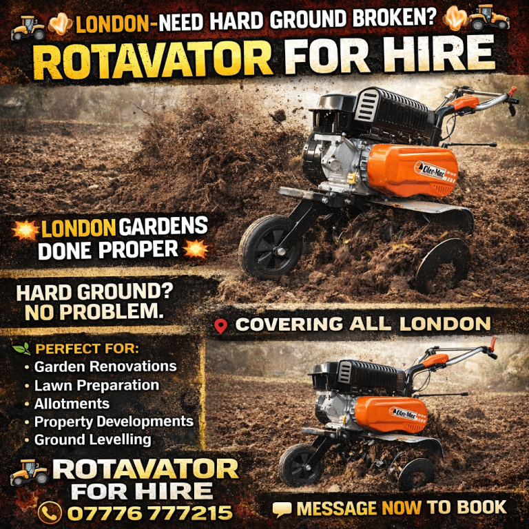 🚜💥 LONDON – NEED HARD GROUND BROKEN? 💥🚜 ROTAVATOR FOR HIRE 🔥 SMASH THROUGH COMPACTED SOIL 🔥 RIP UP WEEDS & CLAY 🔥 READY FOR TURF, TOPSOIL & NEW LAWNS STOP STRUGGLING WITH A SPADE ❌ LET THE MACHINE DO THE DAMAGE 💪 🌿 PERFECT FOR: • Garden