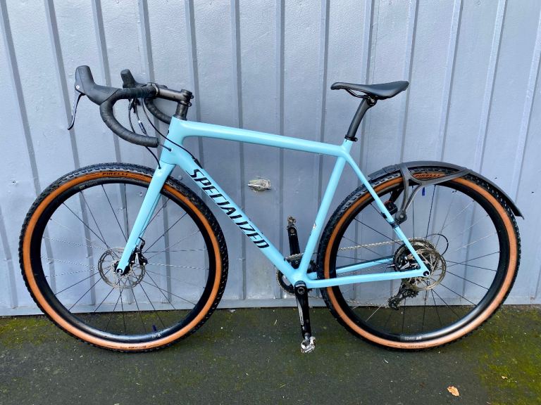 In Specialized’s Large 56cm size Carbon frame . Full Carbon Fork . 12mm Bolt thru axles front & rear . SRAM Rival drivetrain : 1x11 gears . SRAM Rival Hydraulic Disc brakes : 160mm rotors . Pirelli Cinturato Gravel M 700c x 45c gravel tyres . D
