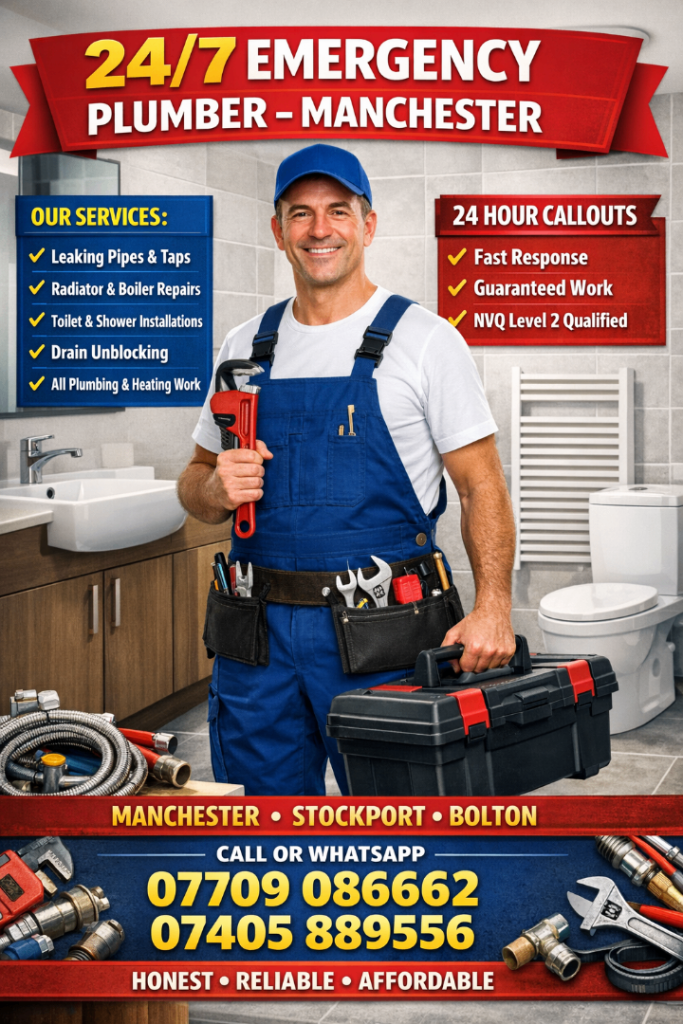 We Offer Fast Efficient/Reliable/Plumbers In Times Of Need 24/7 365 days A year We Are Always Available And Most Of the Time we can Get A Plumber Out To You Within 15 Minuit's Of Your Call To Us As long As You Are Based Around Manchester Greater Man