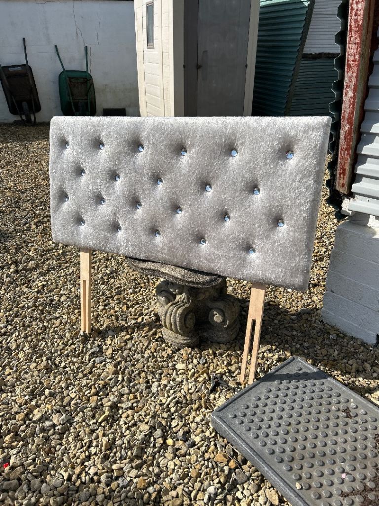 Lovely pink velvet headboard for a double bed, in good condition. It has a nice paneled design and feels soft to the touch. There are minor signs of use, but overall it's well-maintained and sturdy. Perfect for adding a touch of colour and comfort to