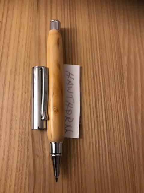 Pen made of Hawthorne Wood, finished off with beeswax and superglue, glue gives a nice hard finish with good protection to the wood. Smooth shiny finish, fits comfortably in the hand. Medium weighted pen. I sell my pens at Focus Craft Fairs and car b