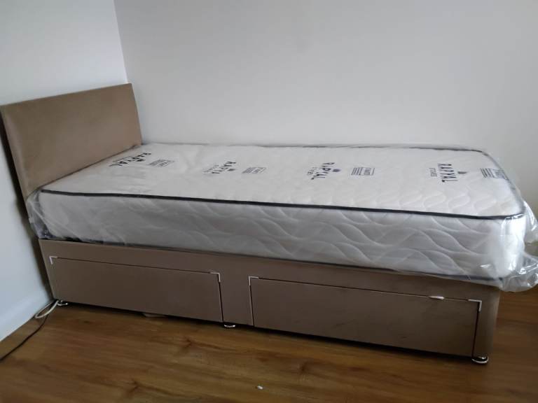 Single bed with 2 drawers, headboard and mattress (still covered in plastic bag). Used bed, less than 2 weeks old and is being sold as no longer reqiured. Cost £235 new. Buyer must collect.