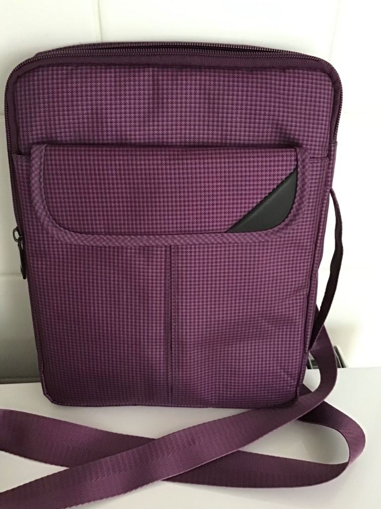 Purple/Black shoulder tablet bag with the following: Zipped Main Section, Zipped Back Section, Front Section, Side Handle, Strap Size: L 11in x W 8.5in New - no tags