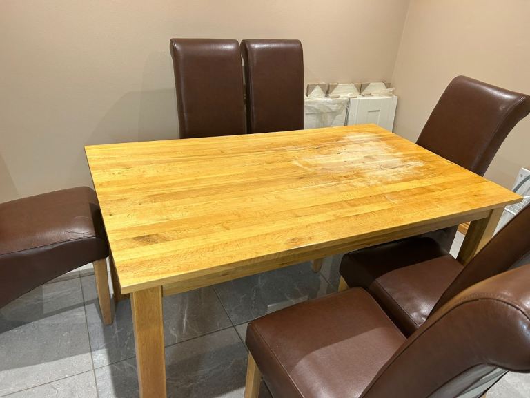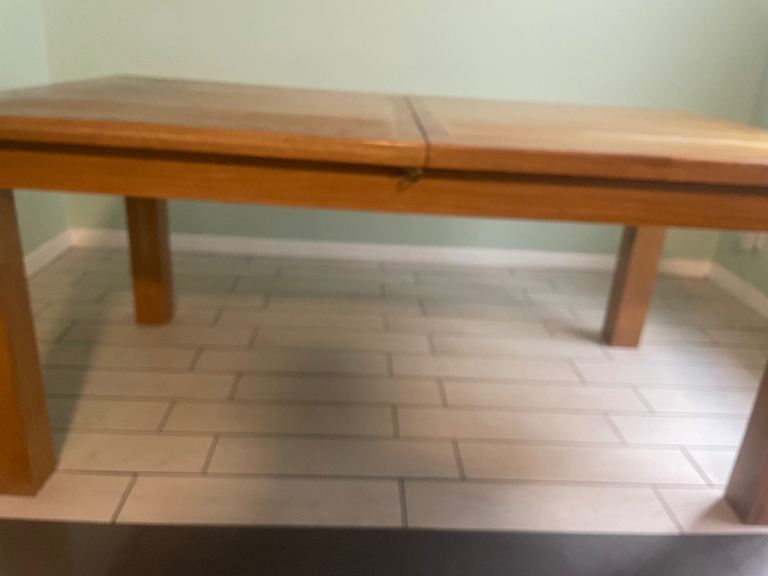 6 seater solid oak table,extending to 8 seater.lacquer on top slightly wore at one side.see from pics.measurements are 71 inches extending to 91 inches.height is 31 1/2 inches