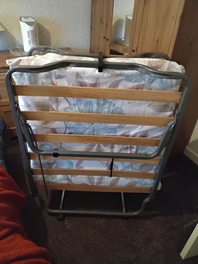 This is a folding guest bed in great condition. It's approximately 2ft 6in wide by 6ft 6in long The base is very sturdy whilst the mattress is good with an extra protective cover. It's very simple to set up and easy to move due to wheels. Great for