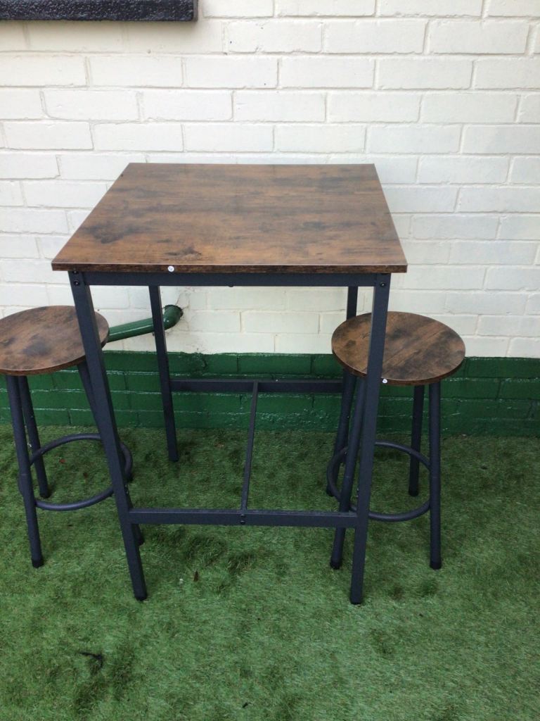 Dining table bar table Breakfast bar with 2 stools industrial steel frame rustic brown and black never used sell for50 hight 37 inches x 24x24 inches table top.stool hight 24 inches as new