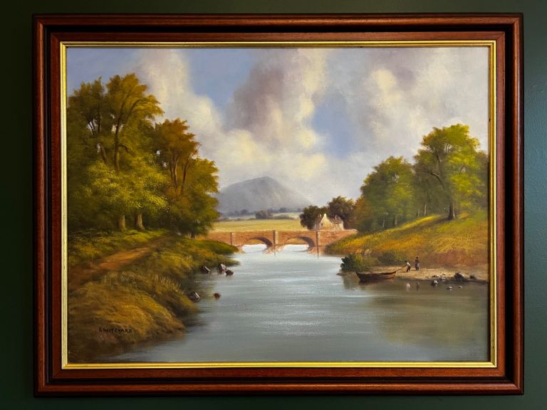 Price £125 An Extremely large Vintage Original hand painted oil on canvas framed painting, Artist & age:- unknown. A great country/farmhouse piece, Featuring a large grey Weimaraner “type” dog & a Golden Retriever in front of the white horse “S