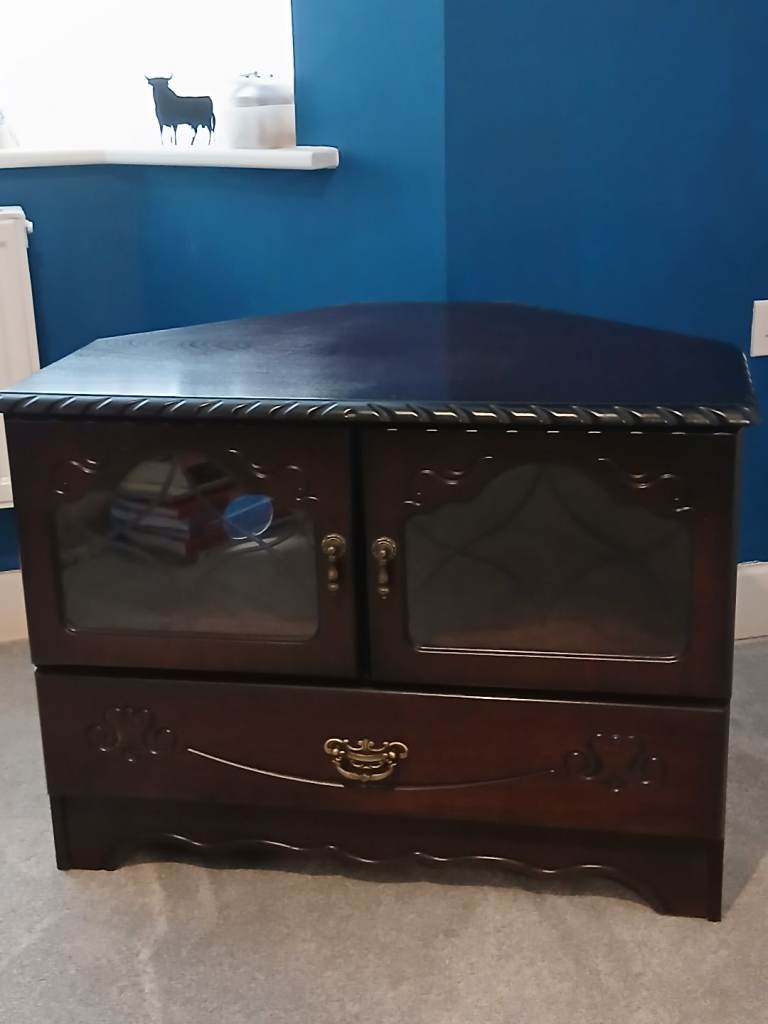 TV corner stand in polished wood. Space under for recorder or sound bar. Bottom draw for accessories.