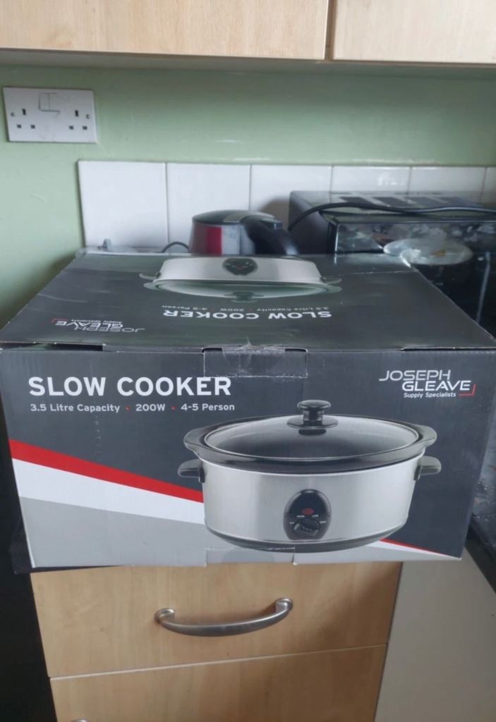Brand new Joseph Gleave Slow Cooker, still in its original box. Features a 3.5 litre capacity, perfect for 4-5 people and 200W power. Never been used, ready to go to a new home.