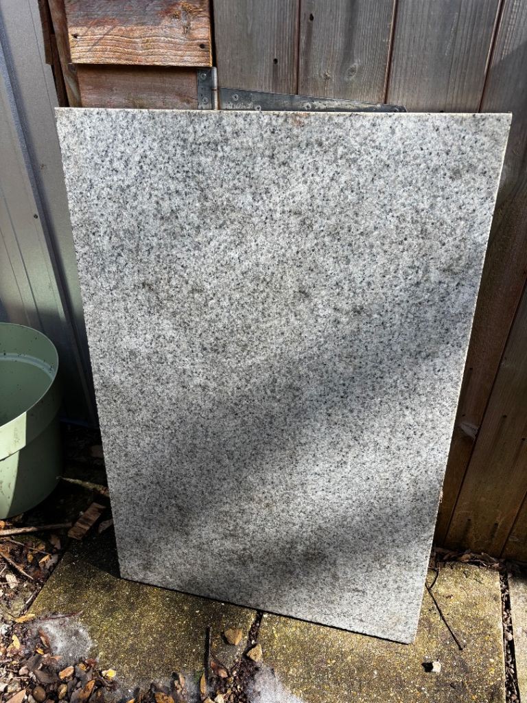 12 60cm x 90cm white and grey flecked granite slabs, approximately 25mm thick. Used. Collect only.