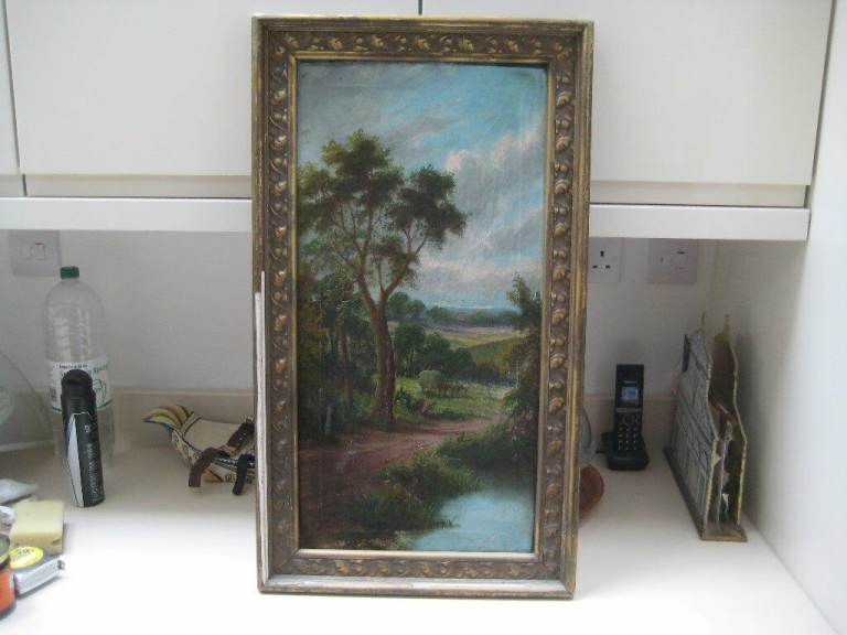 Original 19th century oil on canvas painting of Hay wagon by river in ornate gilt frame, some gilt missing, picture has a few small repairs due to age, size overall 28 x 15 1/2 inches