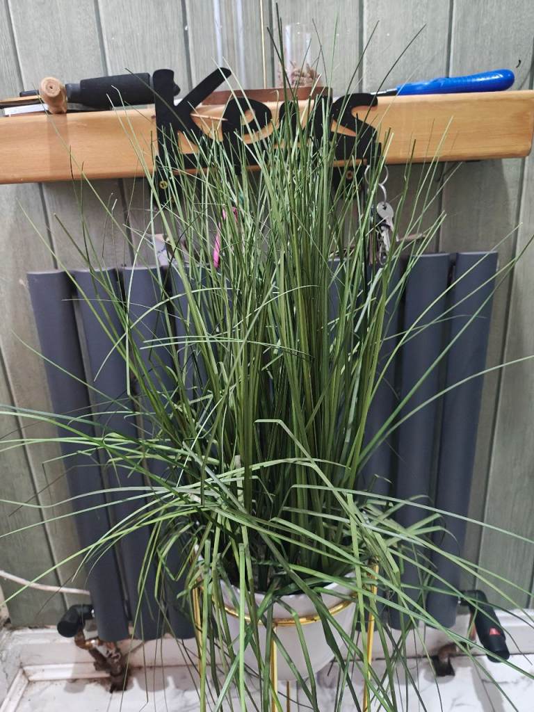 Lovely artificial tall grass plant, perfect for adding a touch of green to any room. Comes with a stylish gold metal stand that is sturdy and in good condition. The plant itself is very realistic and requires no maintenance, always looks fresh. Excel