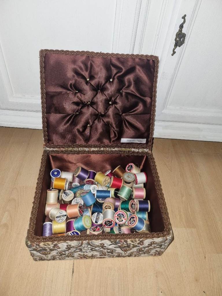 Job lot of sewing thread in tapestry box As seen in photo Lots of thread in beautiful tapestry box with fitted lid Cash on collection please