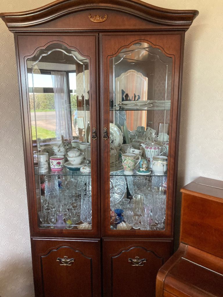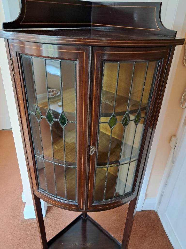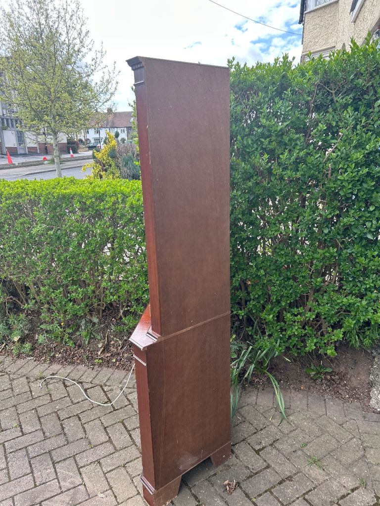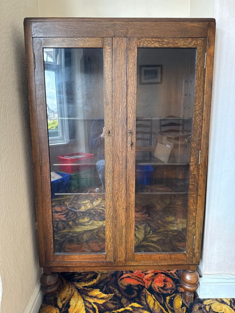 Probably oak bookcase/display cabinet with three adjustable shelves and locking glass doors. 58” tall 33” wide 14” deep