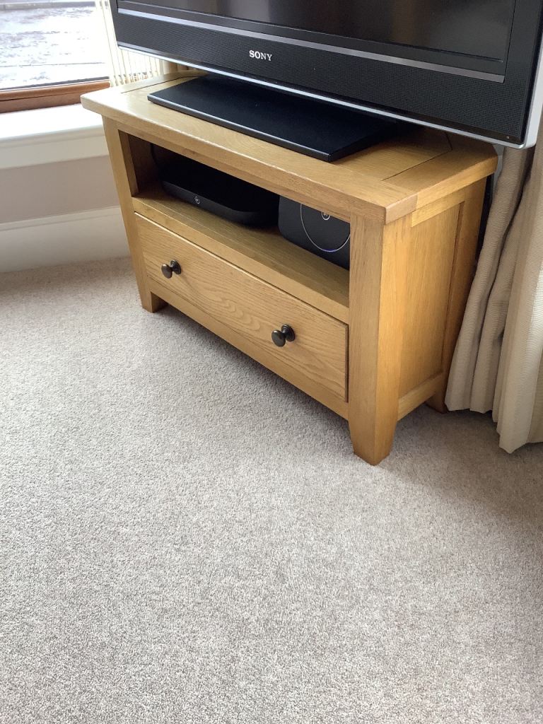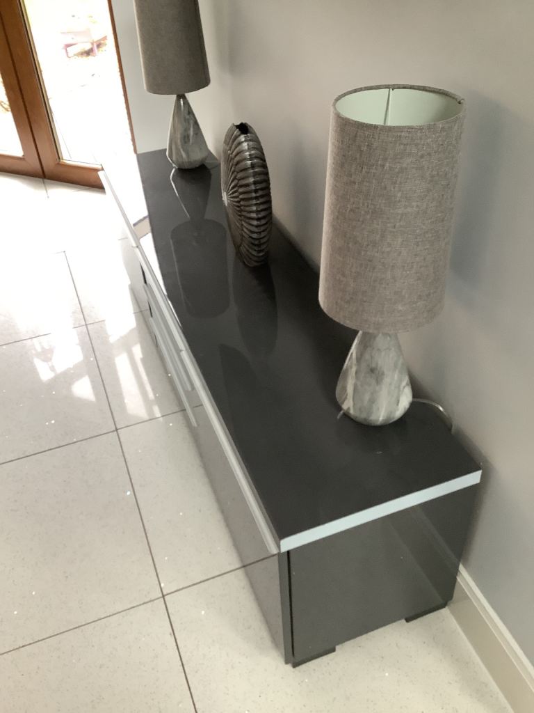 Grey with silver detail 2 pull out drawers and 3 shelves. L= 180cm B= 40cm H= 50cm