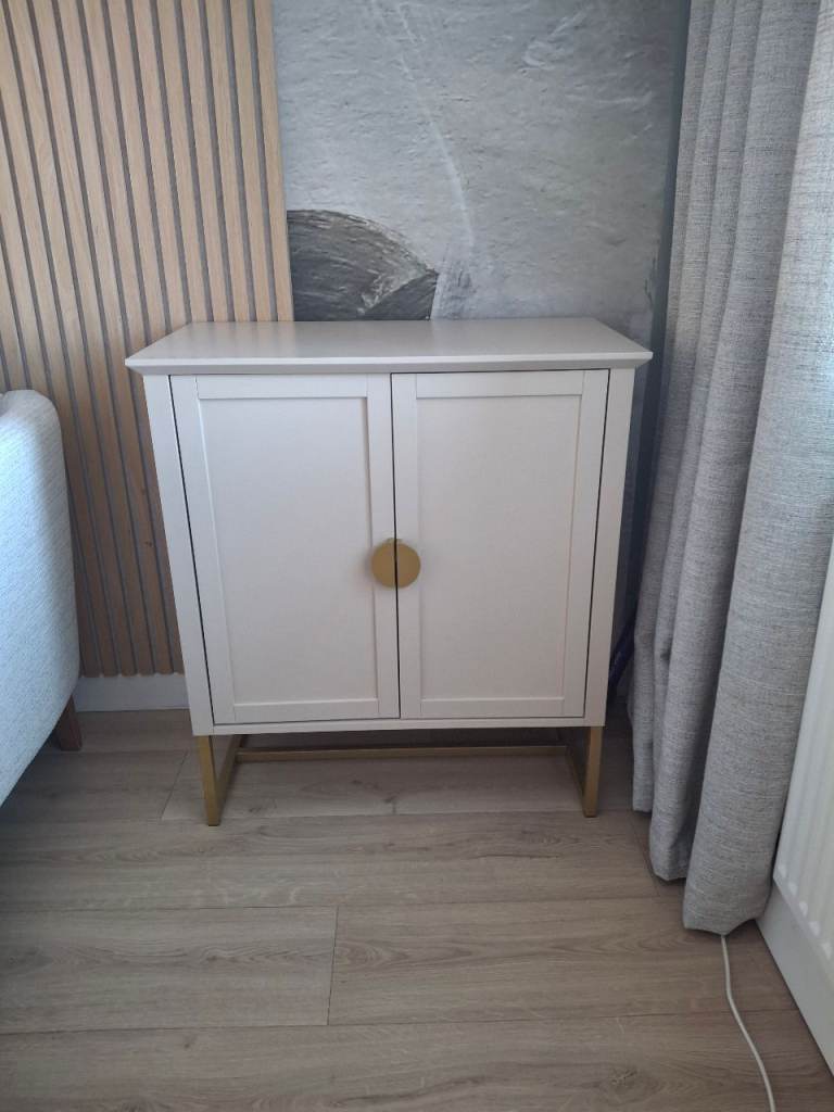 Two matching 2 door sideboards on gold legs Taupe coloured Dimensions Lenght 75cm Height 85.5 cm Depth 40 cm New purchased wrong size for room willing to sell individually