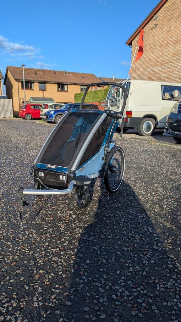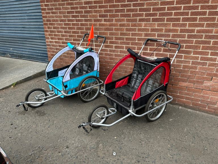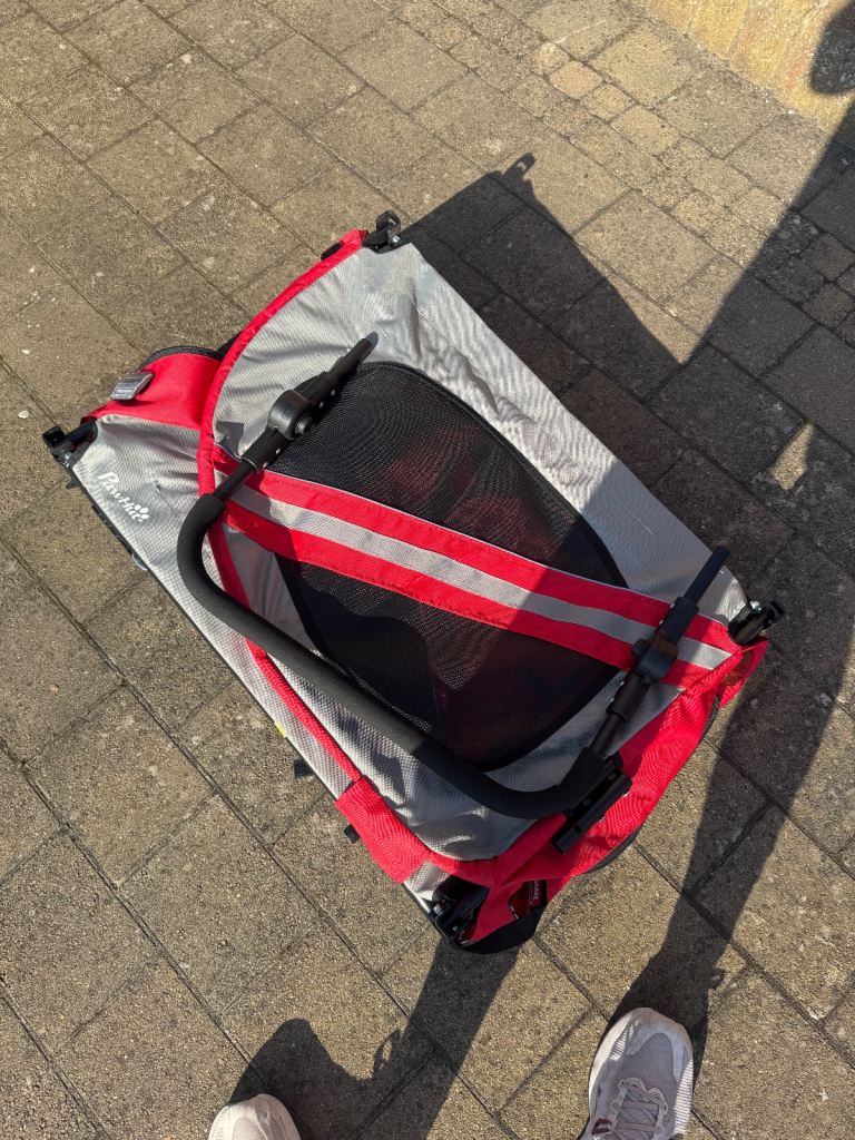 Steel bike trailer from Halfords, was bought at £100 and used twice. Can accommodate child as well. Black and red