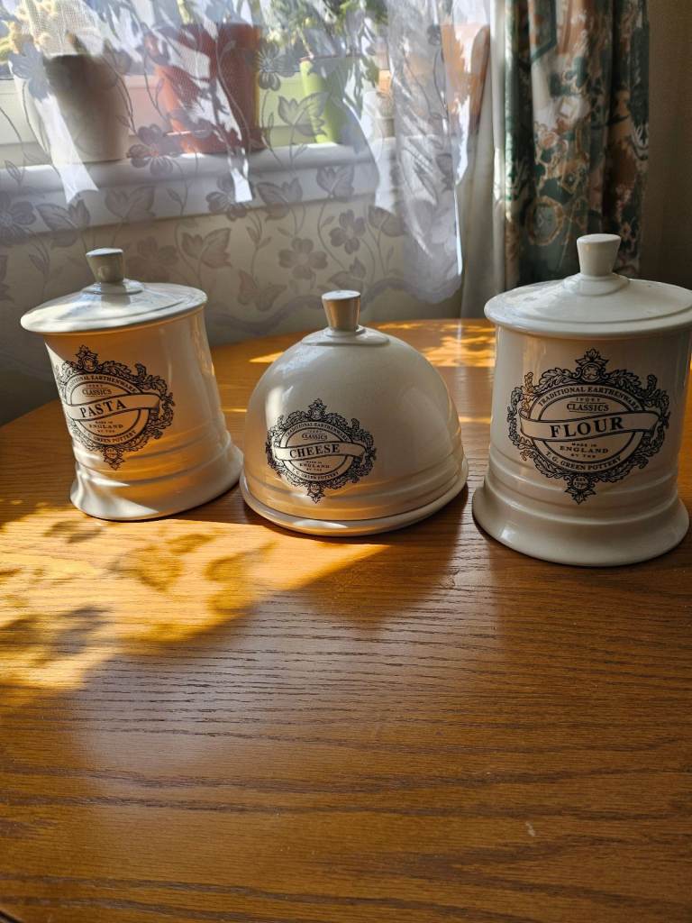 Cloverleaf Ivory Classic kitchen ware 3 peices.1 pasta storage jar.1 flour storage jar. 1 Cheese Dome in cream with black writing all these items are in beautiful condition as they are at least 25 ,years old on Ebay they would sell for at least