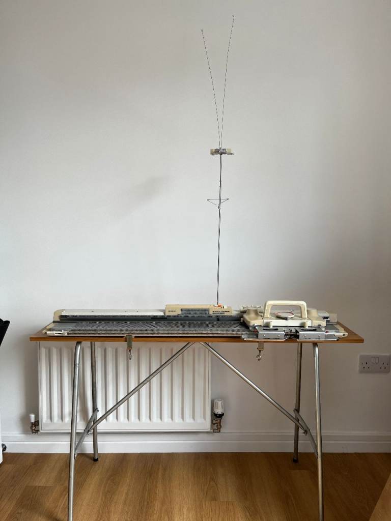 White effect laminated table top with carpet protectors intact. When expanded sits approx. 70 cms from floor. 120 x 31cms length x width. Made for machine knitting and ribbing attachment however could be used for other stuff. Good used operational co