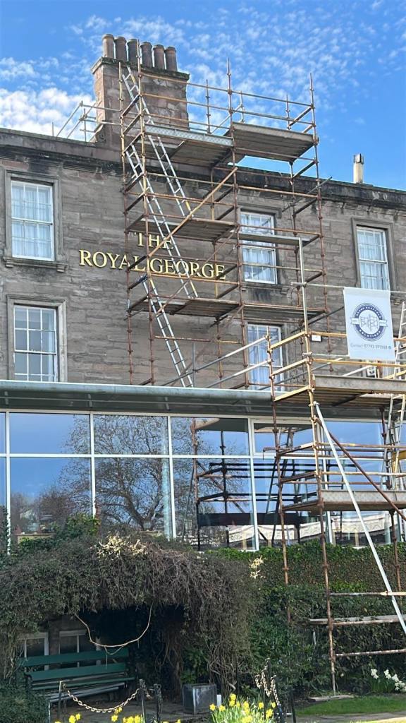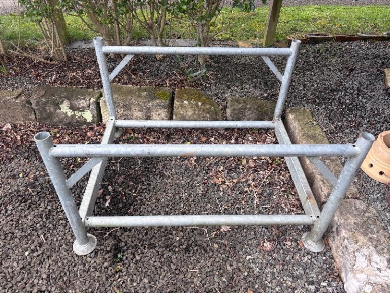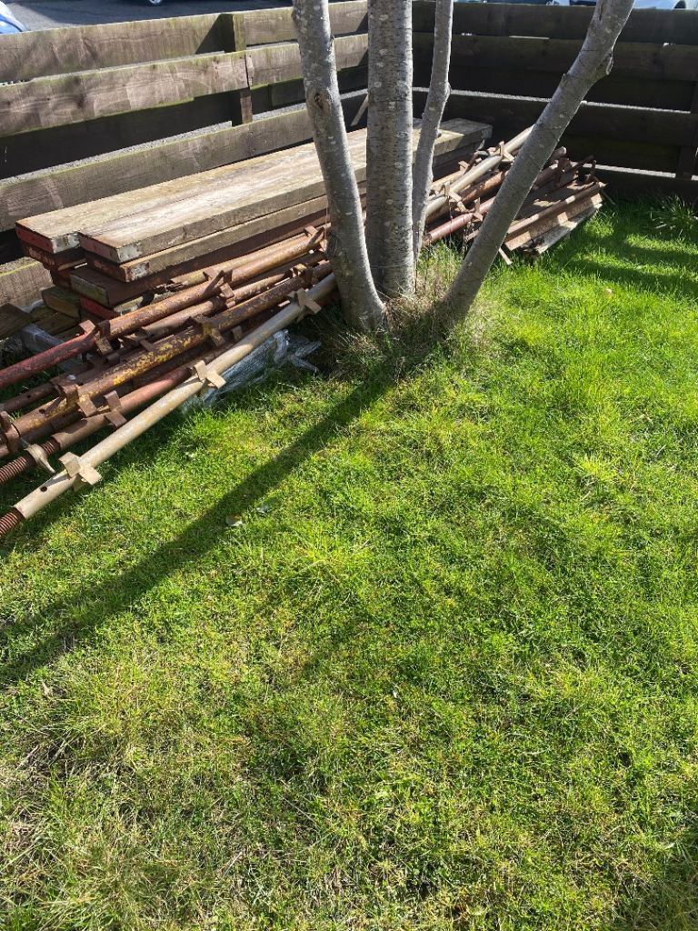 Small scaffold. Enough for access to single storey garage or extension. I THINK the proper terms are 4 standards with adjustable feet, 4 ledgers and 4 transoms. 10 mixed boards. Used for my extension no longer needed. Bought for £225 selling for £150