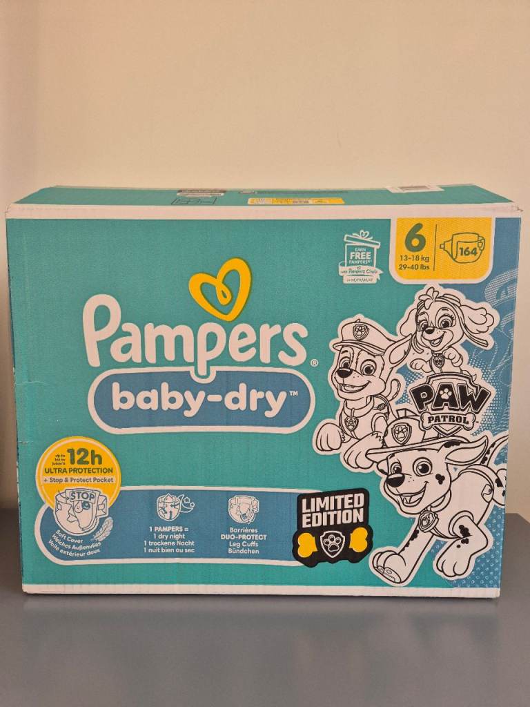 Box of 164 BN pampers paw patrol baby dry nappies. Size 6.