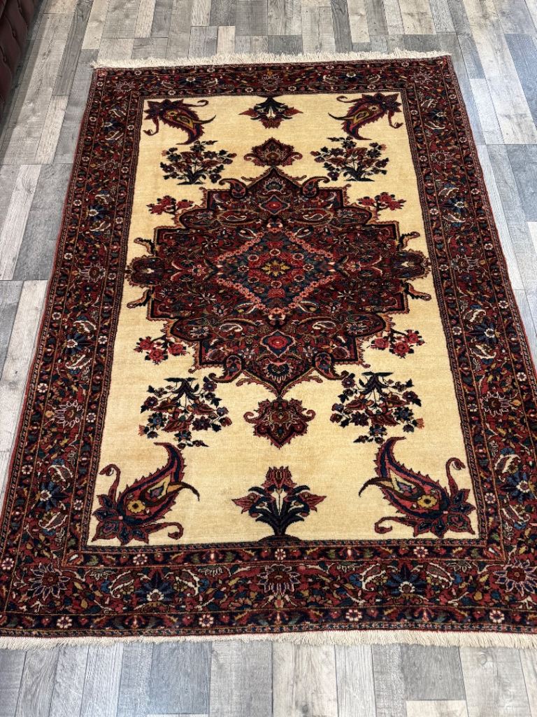 Here is an Antique handmade Persian Bakhtiyar rug in great condition and aged around 75 yo 90 years, well looked after Material : wool Measures : 210 x 145 cm Professionally washed Comes with a certificate of authenticity Viewing and coll