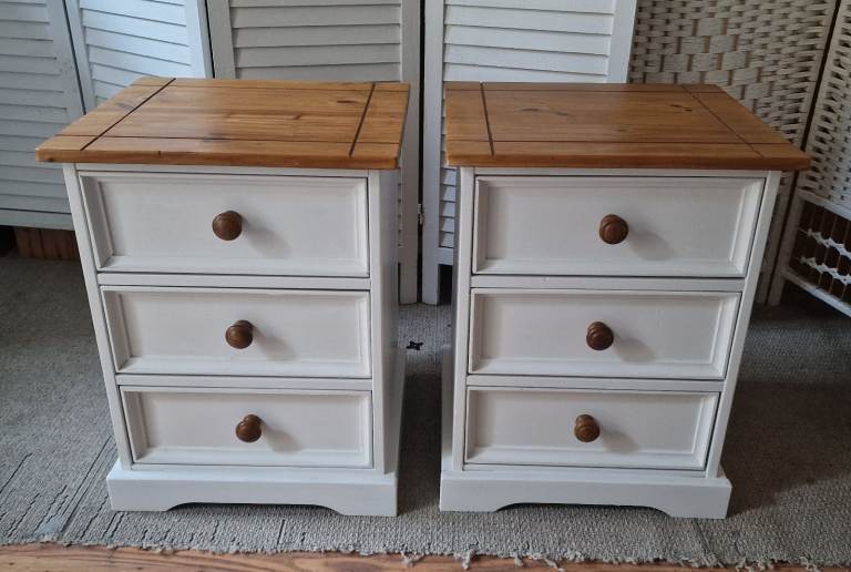 Recently painted and upcycled pair of wooden bedside cabinets 45cm w 49cm D 58cm H Tops have been sanded down and revarnished Base's have been painted with off-white satin 3 drawers in each with replacement wooden knobs all working perfectly A l