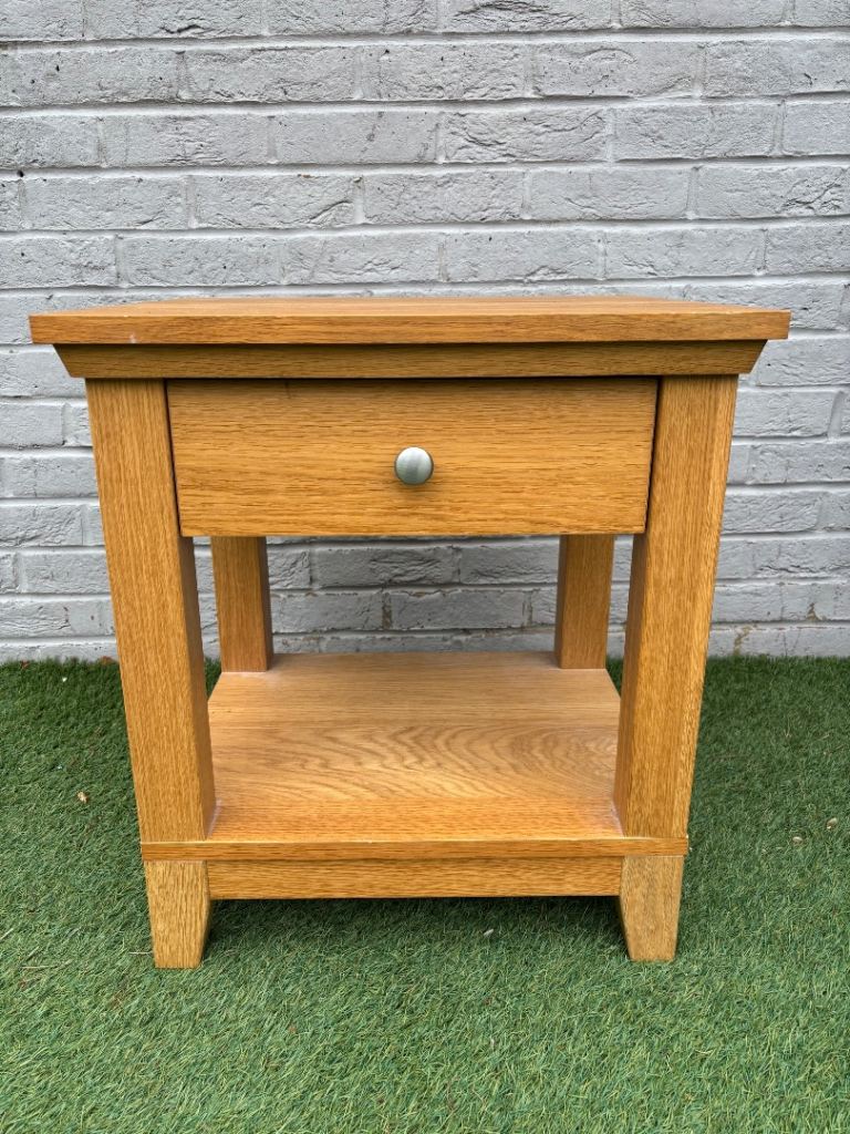 Solid mid-oak bedside table with single drawer in good condition. Features a handy open shelf below. This sturdy piece of furniture is perfect for a bedroom or as a small side table. Dimensions H 58cm D 44cm W 52cm