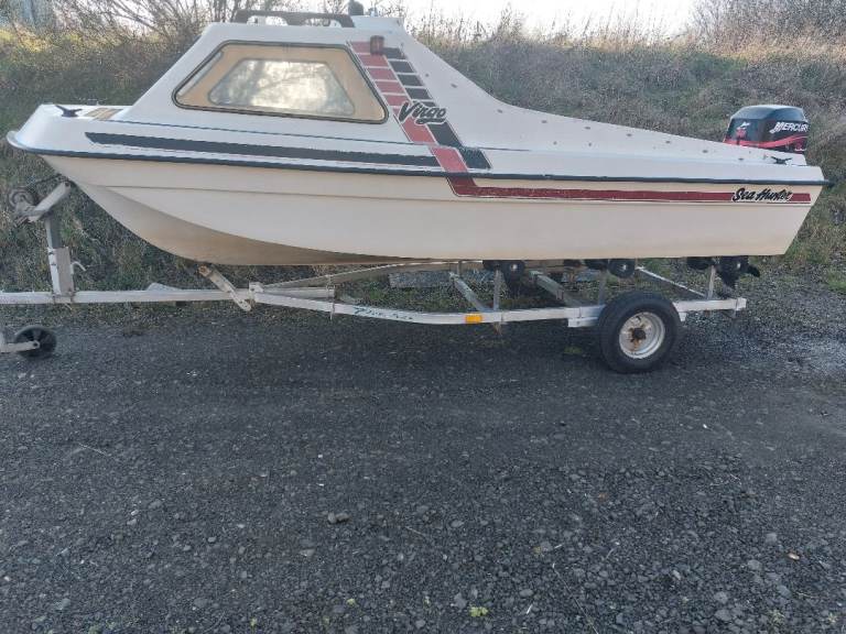 For sale is this Sea Hunter virgo 15 1/2ft fishing boat. Nice economical four stroke engine serviced last season. Power trim and tilt. New tyres and wheel bearings fitted. Forward cushions, open deck, paddles, anchor, fenders. Ready for the season.