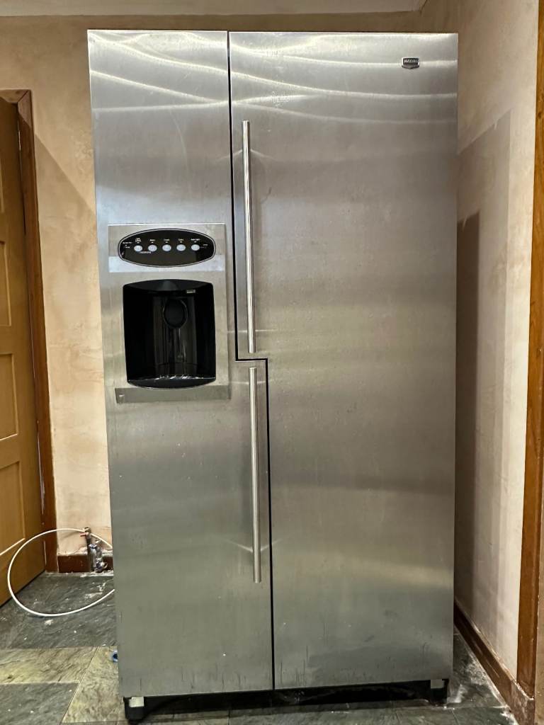 Maytag American style stainless steel fridge freezer Good working order and all interior shelves etc. intact Cold water and ice dispenser Some surface marks on lower doors but otherwise in good condition, with no dents Will need to be collected