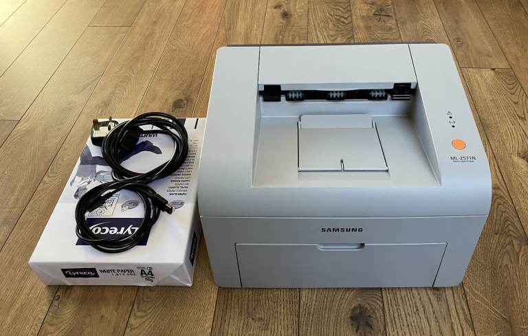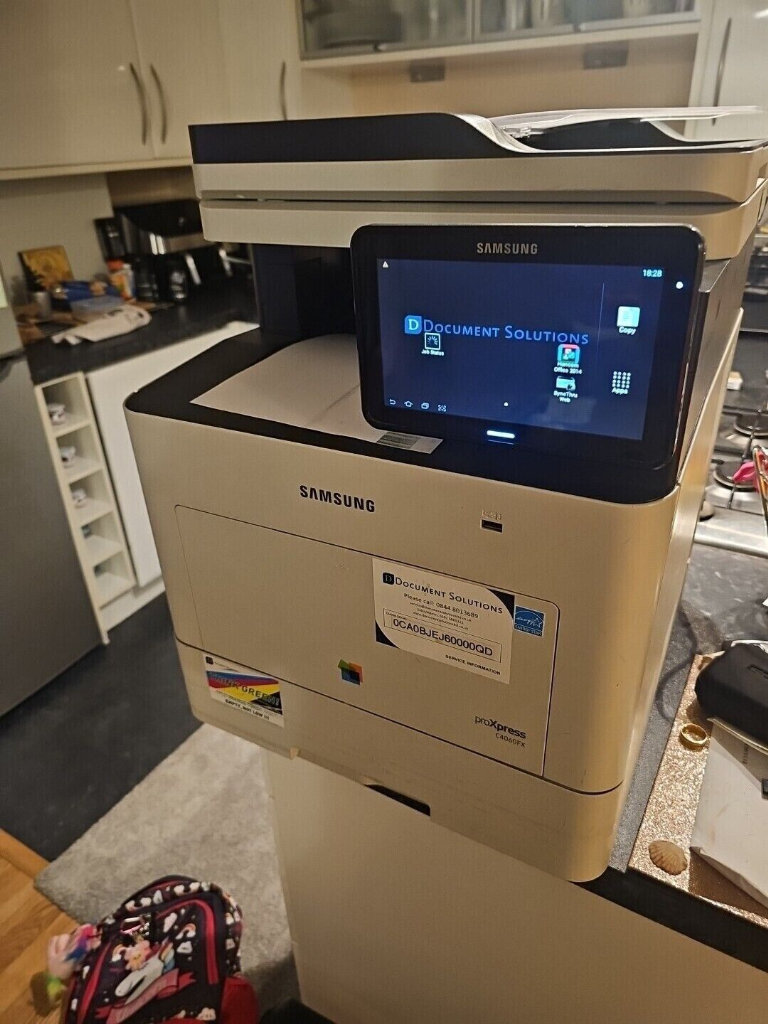 Recently bought as a part of office equipment of bankrupt company. The printer starts and works, but during test printing, it makes a cracking noise, I have no idea what it could be, so I didn't try it again. The paper that came out was all in colour