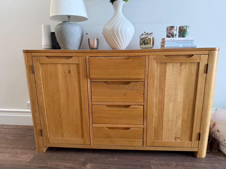 Solid Oak Sideboard 3 drawers & 2 door cupboard with 1 internal shelf A solid oak sidebaord. No veneers. In very good condition. Currently used in a living room. H: 95cm W: 110cm D: 45cm #cupboard #sideboard #vinylstorage #vinylrecords