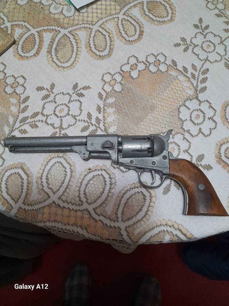 This is an excellent copy of an old western cowboy pistol and looks very authentic. It is made of metal and wood, the barrel revolves and would even take a brass blank. Please note. THIS IS NOT MADE TO FIRE AND UNABLE TO DO SO. It is purely decorati