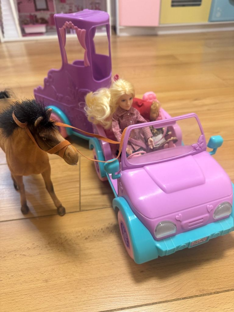 A Lego Friends Horse Vet Trailer and Vet Clinc, which includes the follow: • Includes 2 mini-doll figures: Olivia in her riding jacket, jodhpurs and helmet, and Sophie the vet, plus a gray dapple horse. • Car measures over 2” (6cm) high, 3” (10cm