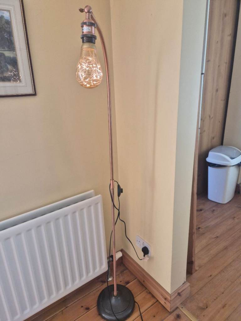 In a copper style finish with a grey base and a foot press on off switch. Excellent condition. Bulb not included. Downsizing so has to go 'hence the price.