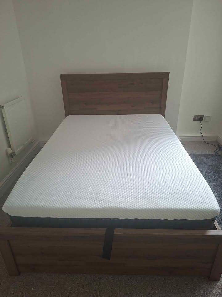 Purchased last week and assembled on Sunday. Selling only because I've decided to go for King size instead, and sadly can't return. Mattress not included. In excellent condition - no marks or damage. Gas-lift ottoman storage works perfectly and