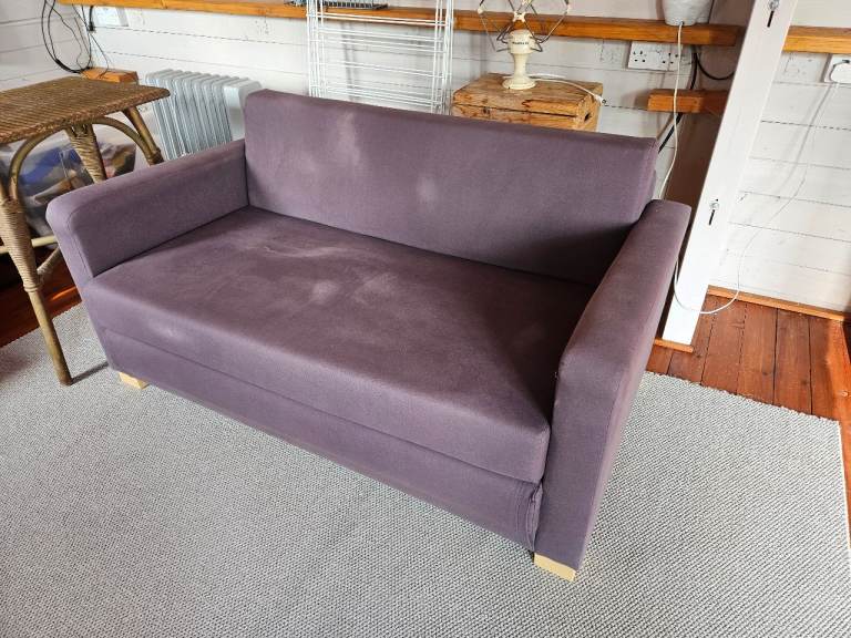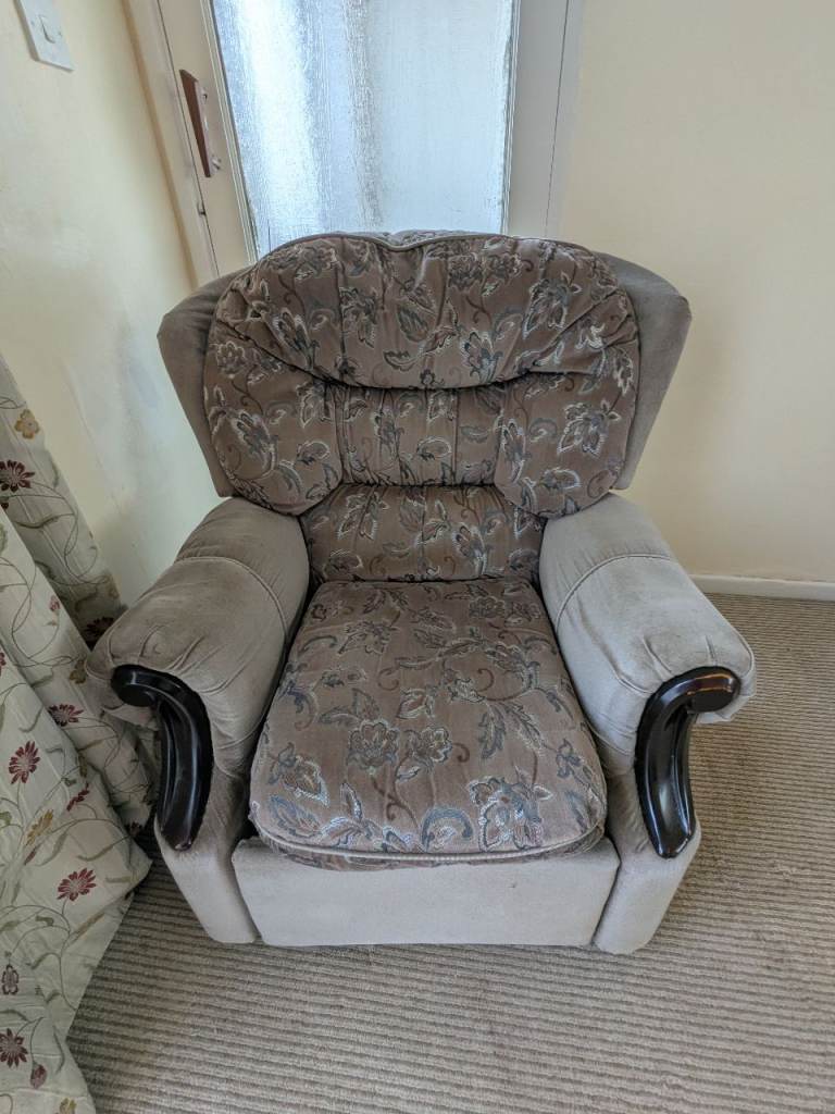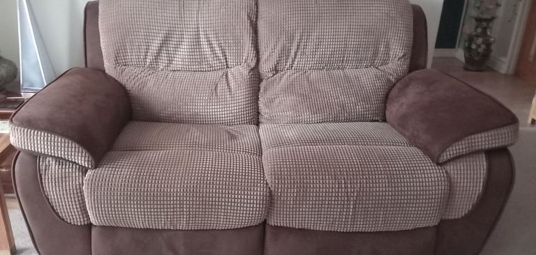 Images show excellent condition. Deep brown arms and lighter for the seats. Thick fabric. Manual recliner. Heavy good quality sofa. Extremely comfortable and supportive. I have no means of delivery.