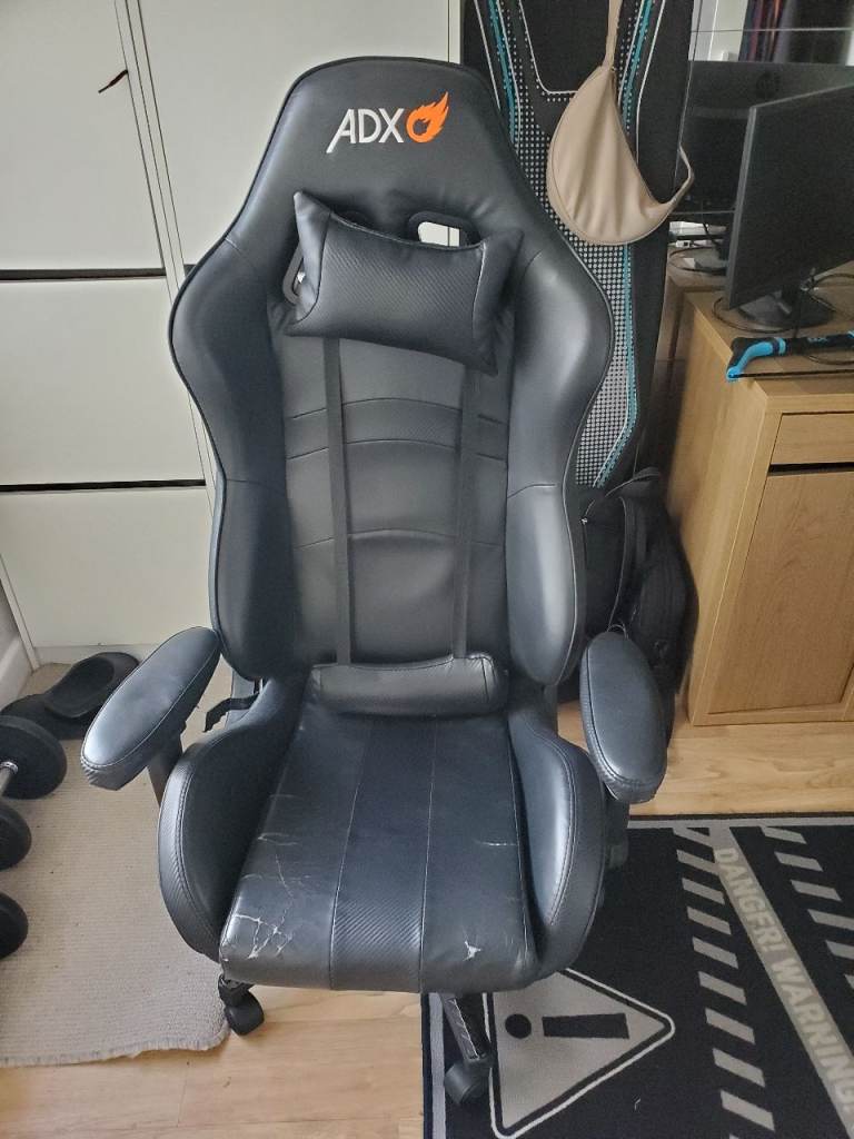 ADX gaming chair in fair condition, used but still fully functional with good support but one arm is loose. Easy fix for someone Features adjustable height and recline, comes with headrest and lumbar support cushions. Ideal for someone needing a com