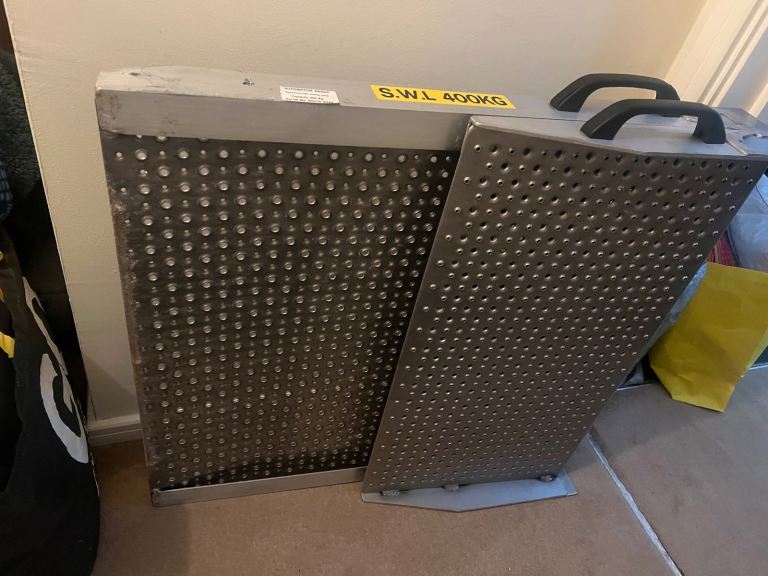 A pair of ‘The Ramp People’ TRP107-10 Telescopic Channel Wheelchair Ramps. They weigh 16.22kg and have a 275kg load capacity with a rest-on connection protected with rubber pads. When fully extended they measure 3m, this unusually long length prov
