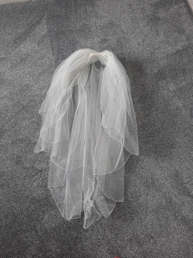 Bridal veil in ivory netting with attached comb. Waist length. In good condition.