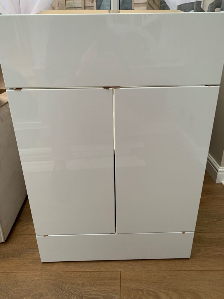 Hudson Reed ‘Fusion’ 600mm width Gloss White Full Depth Vanity Unit. Brand new in original opened box. No defects or damage. Includes door handles and wall fixing brackets. Vanity unit only, no sink or other accessories. Width:600mm Depth:353mm He