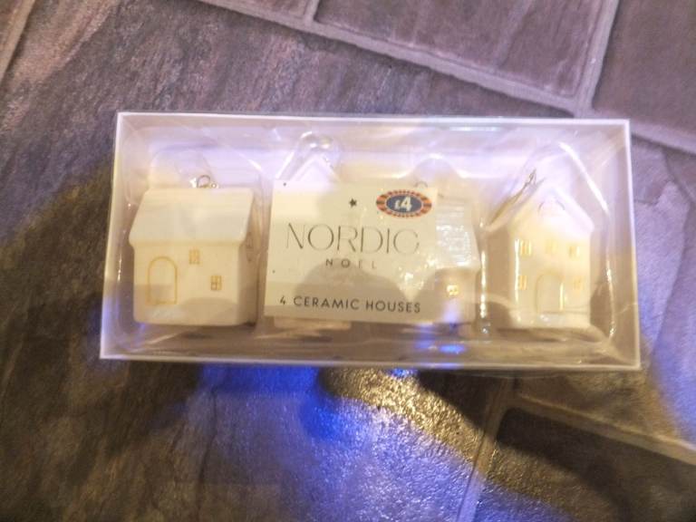 Xmas bells 10cm high, 9cm in diameter. Β£1.75 each cost new Β£3.00. Four ceramic houses in box. Can be used as tree ornaments or stand in a group. Β£2.50 per box cost new Β£4.00. Several of each available.