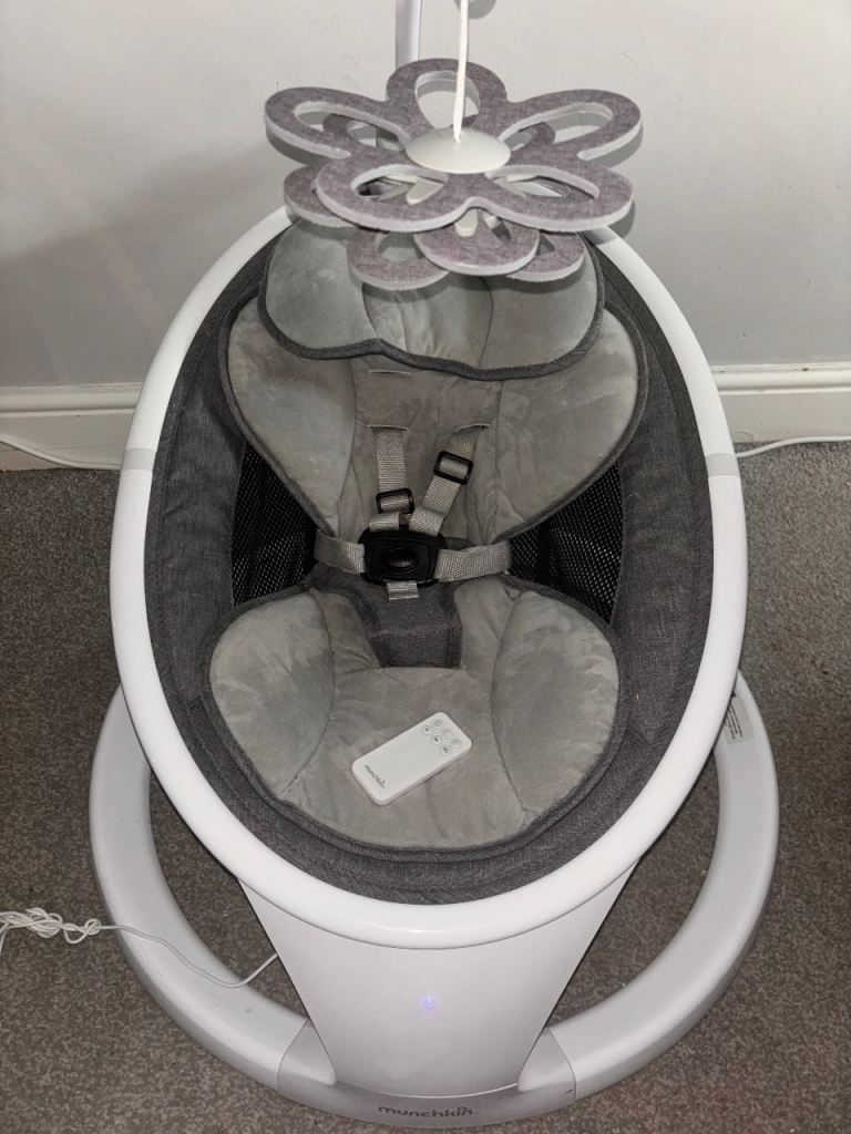 munchkin baby swing, comes with original remote and wire. Also comes with the above mobile from munchkin. Bluetooth compatible, 5 different swing settings, has some white noise and nature sounds already to help baby settle. Paid over 200 wanting 80 o