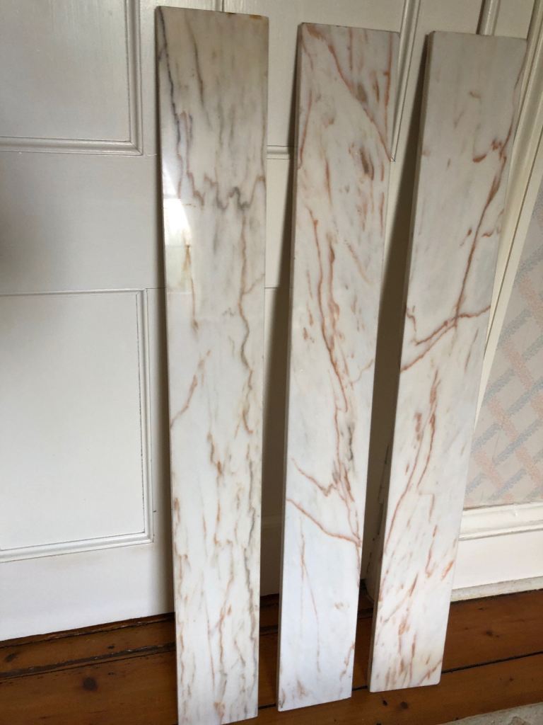 Three polished rose marble slabs, would make elegant shelves or could be incorporated into other decorative work. Dimensions - 123 cm x 15.3 cm Collect from near Tranent or possible delivey depending on your location.