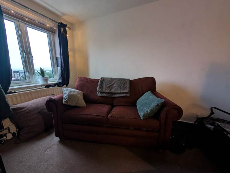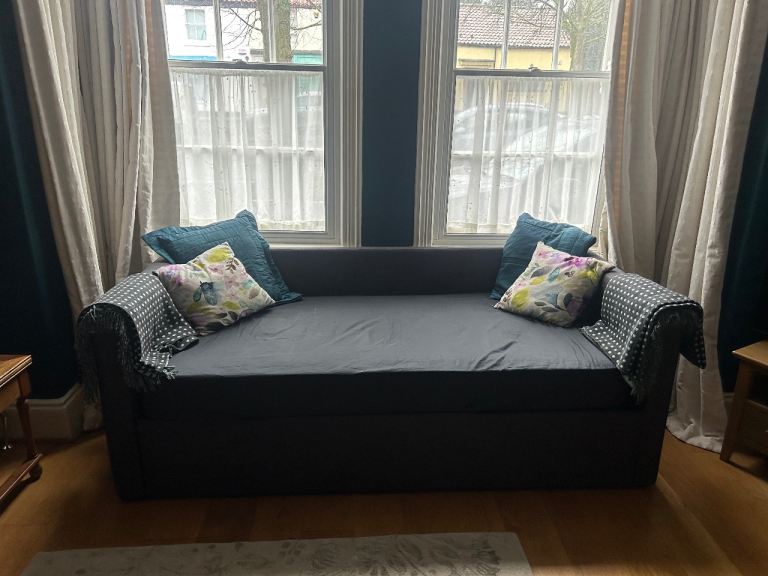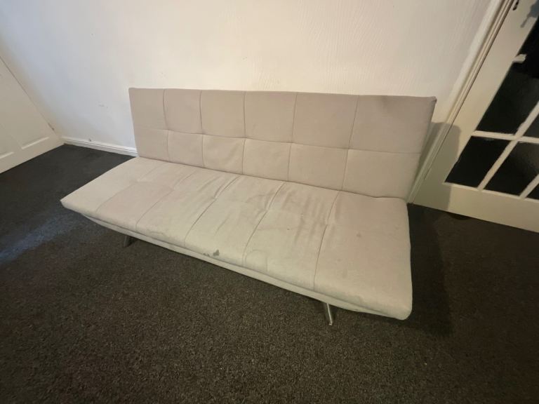 180cm long, sofa that folds flat into a bed, clic clac model. Cream/beige coloured fabric, a few years old but still in reasonable condition. Some coffee stains to the fabric from daily sofa use.