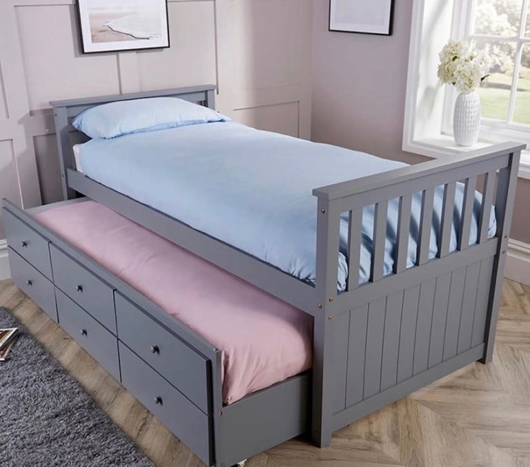 Grey wooden Florida captains cabin bed with pull out trundle bed, 3 storage drawers and 2 clean mattresses. Both are full size single beds. Great for small spaces, a spare room and extra guests. Is in good used condition, bed and trundle is s