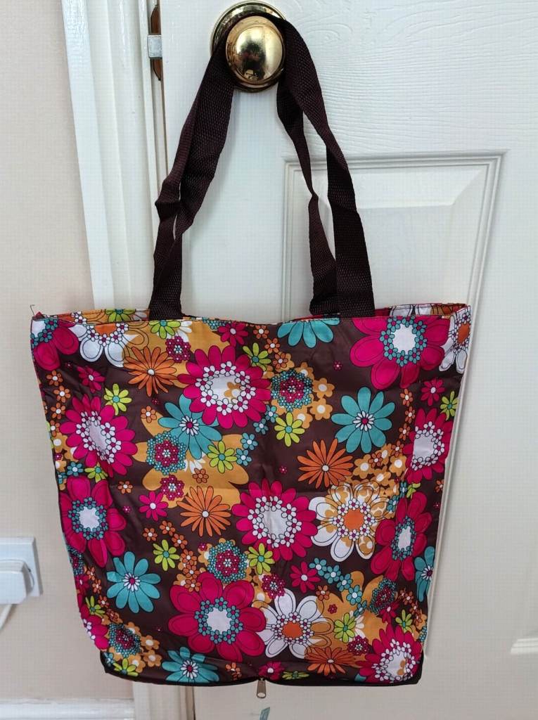 Large capacity tote bag - new unused When not in use folds up into a compact size (with handle/carrying strap) that is lightweight and can easily fit in a handbag, bag or pocket making it convenient to carry with you. Has 2 strong fabric handles (30m