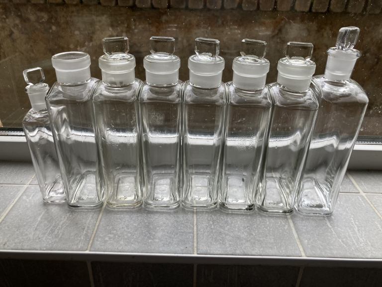Antique pharmaceutical bottles with stoppers that can be used as modern glass containers £70 for all the bottles or £10 for individual bottles