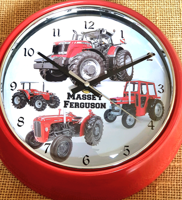 Tractor wall clock Massy, New Holland, John Deere, JCB wall clock APX 10 inch circular Metal surround case Glass front Minimum noise level Free local delivery Postage options are Available.