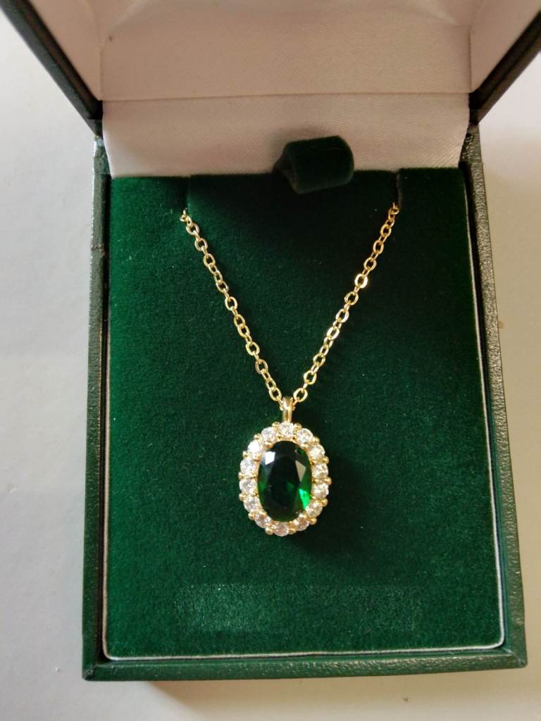 *if you can see the ad than it's still available* New gold plated synthetic emerald and cubic zirconia cluster pendant and chain. Comes in the box in pics Can be collected from Donemana or I can post tracked for £4 I can also meet/deliver around